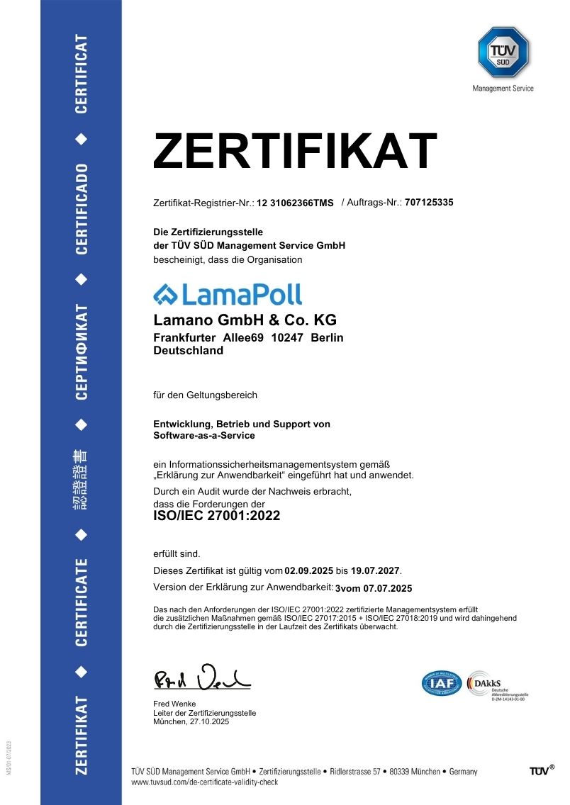 Das Online Umfrage Tool LamaPoll: Geprüft & standardisiert! Wir ergreifen strenge Maßnahmen für die Sicherheit und den Schutz Ihrer Daten. Wir wissen, dass Ihnen die Sicherheit und Verfügbarkeit DSGVO-konformer Online Umfragen wichtig ist und schätzen Ihr Vertrauen in LamaPoll. Aus diesem Grund tragen wir dafür Sorge, Ihnen einen sicheren und stabilen Online-Dienst zu gewährleisten! Das detaillierte Sicherheitskonzept können Sie auch gern bei unserem Support erfragen.