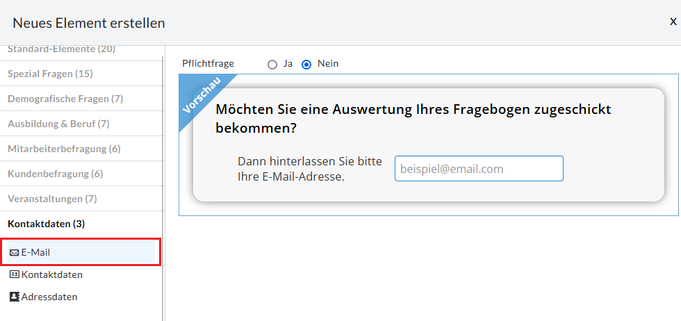 Ja, Sie können für Eingabefelder, in die Umfrage-Teilnehmer Text eintragen können, festlegen, dass nur E-Mail-Adressen als gültige Antworten zählen. Hierfür gibt es zwei Möglichkeiten: