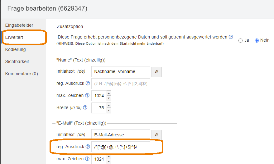 - Alternativ können Sie auch selbst den Regulären Ausdruck bei anderen Eingabe-Fragetypen bei den entsprechenden Einstellungen hinzufügen. Gehen Sie hierzu auf „Frage bearbeiten“ und klicken Sie auf „Erweitert“. Dort können Sie als Umfrageersteller den Regulären Ausdruck einfügen (s. Abb. 2). Wenn Sie ausschließlich E-Mail-Adressen zulassen möchten, lautet der entsprechende Reguläre Ausdruck: /^[^@]+@.+\.[^.]+$|^$/