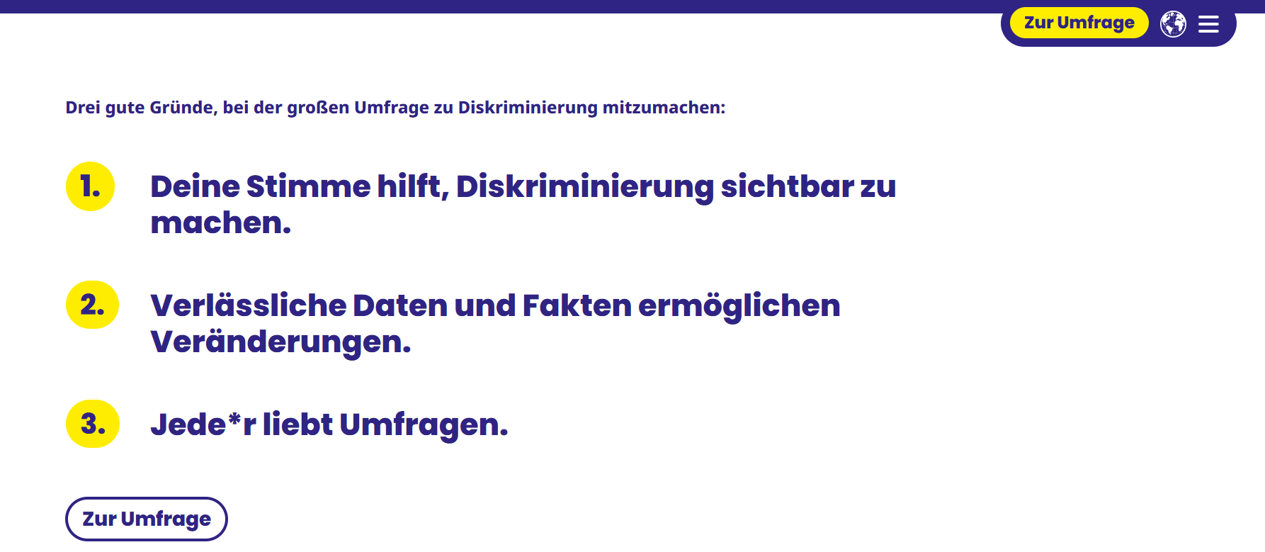 Die Umfrage selbst wird auf einer eigens dafür eingerichteten Website verlinkt, die Interessierte bereits im Vorfeld über das Thema Diskriminierung informiert. Außerdem liefert sie überzeugende Gründe, warum sich eine Teilnahme lohnt (siehe Abbildung 1).