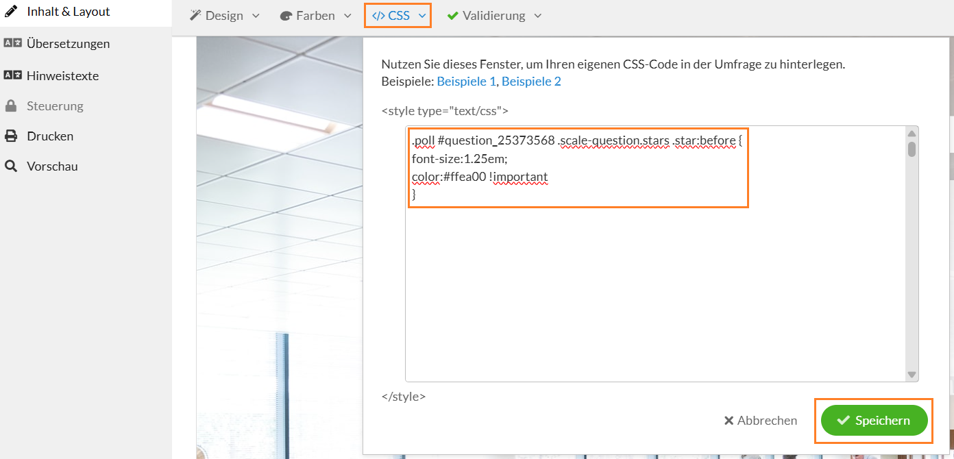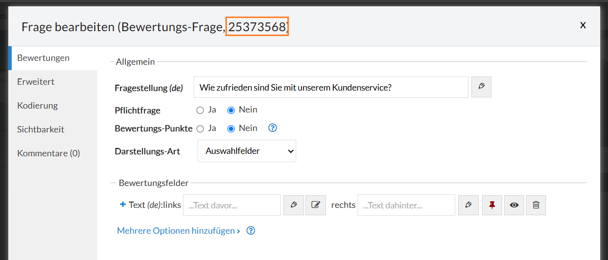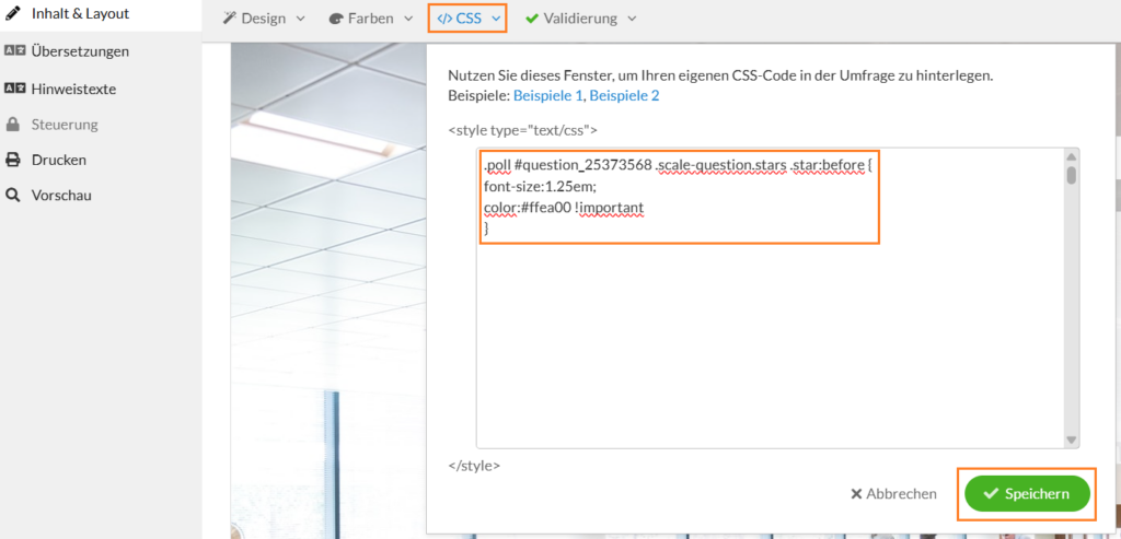 Im nächsten Schritt brauchen Sie zum einen den CSS-Code, den Sie für die Anpassung Ihrer Frage nutzen wollen und zum anderen einen Code, der die Fragen-ID enthält. Letzterer sieht folgendermaßen aus: