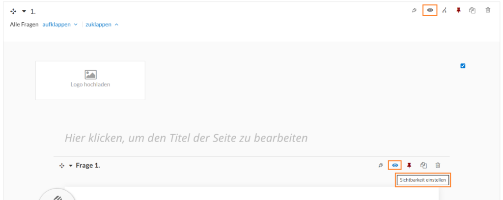 Bedingte Sichtbarkeiten agieren wie Filter, sodass sie für Teilnehmende je nach Antwortverhalten gezielte Frage-Items, Textblöcke, Frage-Elemente oder ganze Seiten ein- oder ausblenden. Diese Einstellungen nehmen Sie jeweils über das Auge-Symbol vor – entweder an der entsprechenden Frage oder an der Seite (siehe Abbildung 1).