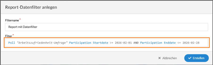 Abb. 1: Report mit Datumsfilter: Umfrage, Teilnahme und Start- sowie Enddatum auswählen.