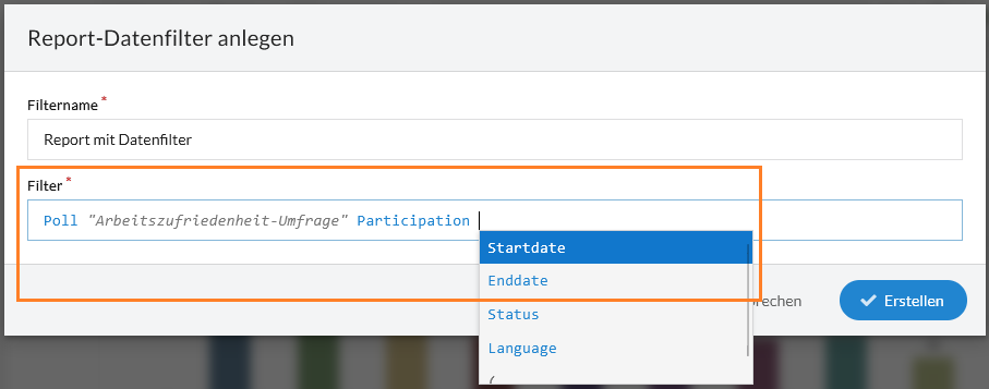 Erstellte Reports sind also grundsätzlich dynamisch. Sie haben aber die Möglichkeit, Datenfilter zu verwenden, wenn z.B. nur die bisher eingegangenen Antworten im Report berücksichtigt werden sollen. Um einen statischen Umfrage-Report für einen bestimmten begrenzten Zeitraum anzulegen, klicken Sie auf das Filter-Symbol rechts oberhalb des Reports, geben einen Filternamen ein und wählen die Filterbedingungen (Umfragename -> Teilnahme (Participation) -> Start der Teilnahme -> Ende der Teilnahme) aus (s. Abb. 1 + 2). Klicken Sie anschließend auf „Erstellen“.
