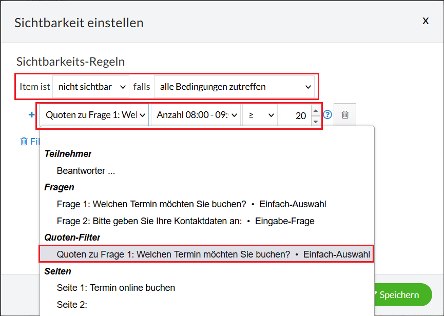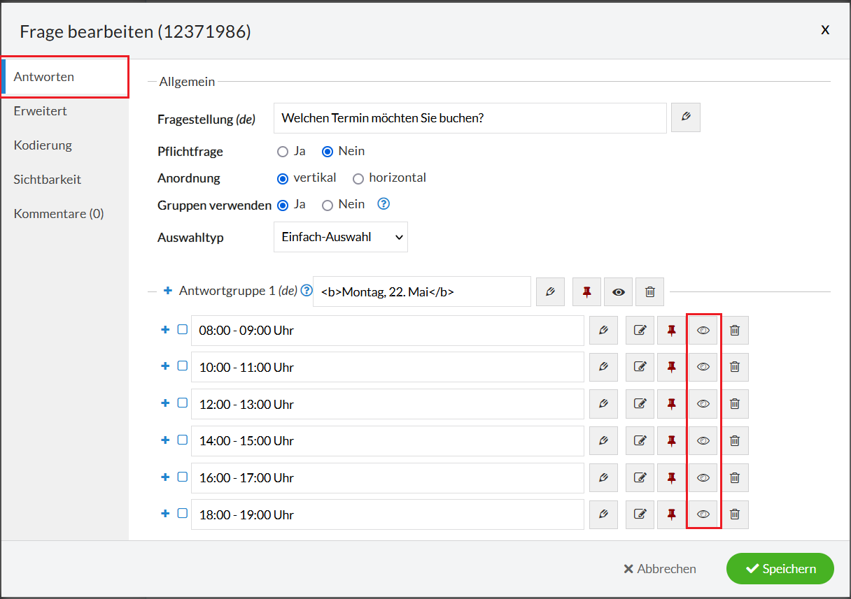 Als Umfrageersteller legen Sie zunächst die möglichen Termine an und legen anschließend über Sichtbarkeitsregeln die maximale Anzahl an Plätzen für jeden einzelnen Termin fest. Klicken Sie hierzu auf „Frage bearbeiten“ und bei den jeweiligen Terminen auf das „Auge-Symbol“ (Abb. 1). Im folgenden Fenster können Sie über Quoten die absolute Anzahl an Antworten (=Terminen) festlegen (Abb. 2). Im unten gezeigten Beispiel sind max. 20 Teilnehmer pro Termin festgelegt. Nachdem 20 Personen den Termin online gebucht haben, ist dieser für weitere Interessenten nicht mehr sichtbar.
