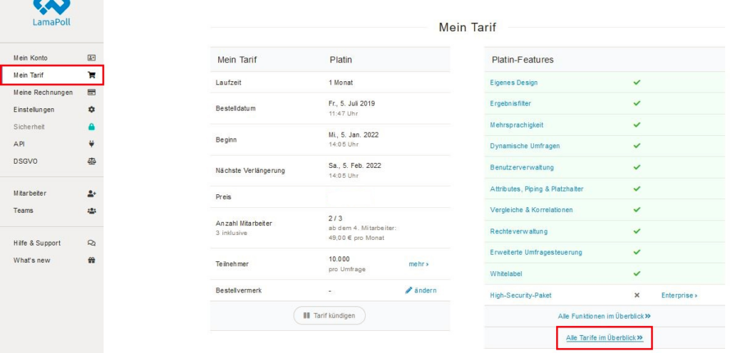 An Ihren Umfragen können generell unbegrenzt viele Personen teilnehmen, je nach Tarif können Sie aber nur eine begrenzte Anzahl an Teilnehmern/Ergebnissen auswerten. Im Free-Tarif können Sie beispielsweise 50 Teilnehmer auswerten, im Basic-Tarif 500, im Gold-Tarif 5000 etc. Wenn Sie mehr Teilnehmer auswerten möchten, als Ihr aktueller Tarif zulässt, können Sie Ihren Tarif jederzeit selbstständig ganz einfach upgraden. Nach dem Upgrade können Sie auch die Ergebnisse der zusätzlichen Teilnehmer einsehen und auswerten. Ihren aktuellen Tarif (inkl. Laufzeit, Features, Details) können Sie im Tool unter „Mein Tarif“ aufrufen (s. Abb.). Dort finden Sie auch einen Link zu einem Überblick über alle Lizenzen & Tarifoptionen.