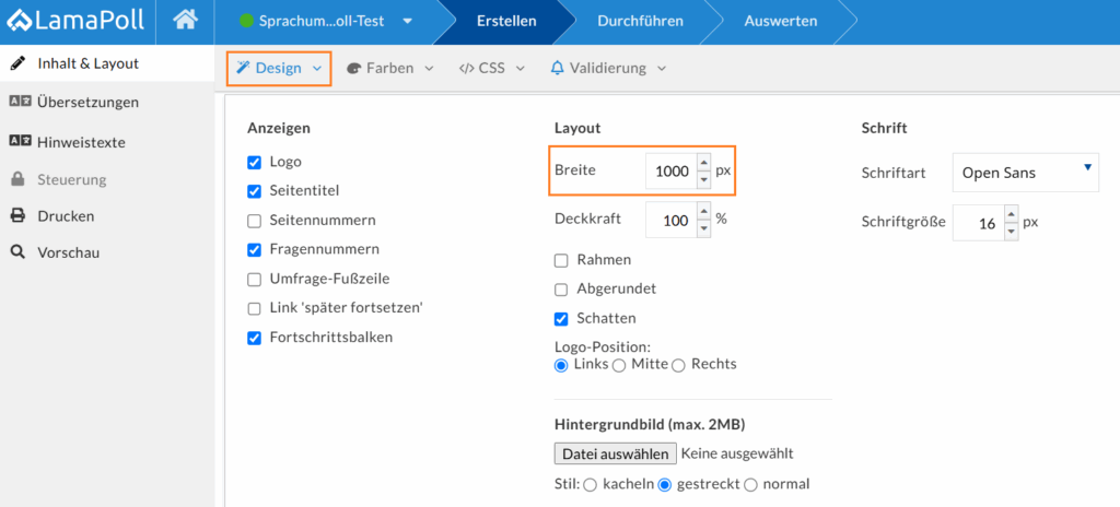 Ja, das ist möglich, Sie können die Breite Ihres Fragebogens beliebig anpassen. Klicken Sie dazu zunächst auf den Menüpunkt „Design“, der sich oben links neben „Farben“, „CSS“ und der „Validierung“ befindet (siehe Abbildung 1).