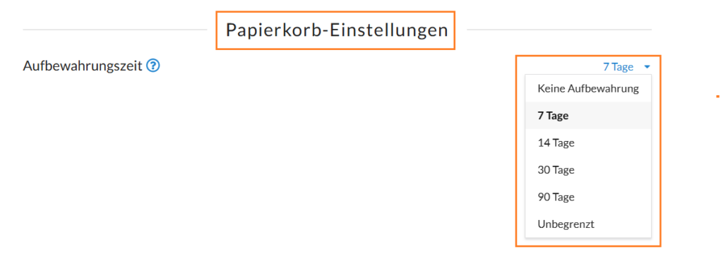 Bei Einzelaccounts kann die Aufbewahrungszeit im Papierkorb jederzeit vom Benutzer geändert werden. Klicken Sie sich dazu zunächst zum Papierkorb und von dort aus weiter zu „Einstellungen“. Wählen Sie nun Ihre bevorzugte Aufbewahrungszeit über das Drop-down-Menü aus (s. Abb. unten). Nach Ablauf der festgelegten Frist werden die Umfragen automatisch und unwiderruflich gelöscht. Das gilt jedoch nicht, wenn Sie „Unbegrenzt“ auswählen. Dann verbleiben alle Umfragen im Papierkorb, bis diese manuell gelöscht werden.