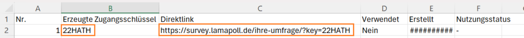 Einmal heruntergeladen, können Sie die Schlüssel bzw. Direktlinks zur Umfrage mit den Schlüsseln (https://survey.lamapoll.de/[Umfrage-Name]/?key=[Schlüssel] über Ihr eigenes Mailing-Programm oder auf anderem Weg verteilen. Eine genaue Anleitung dazu finden Sie auch in unserem Helpdesk: Generieren und Download der Zugangsschlüssel im Tool