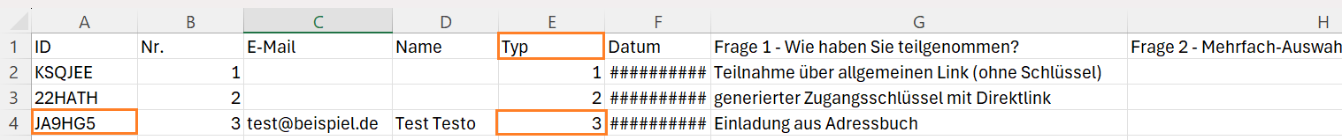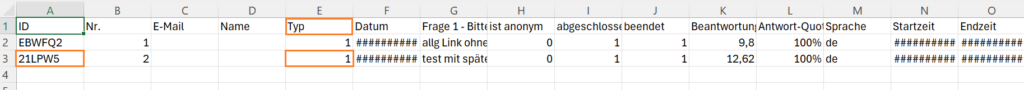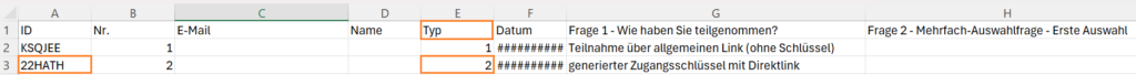 Auch im Rohdatenexport finden sich der Zugangsschlüssel sowie die Kennzeichnung „Typ 2“ – Teilnahme über den individuellen Zugangslink – wieder (siehe Abbildung 8).