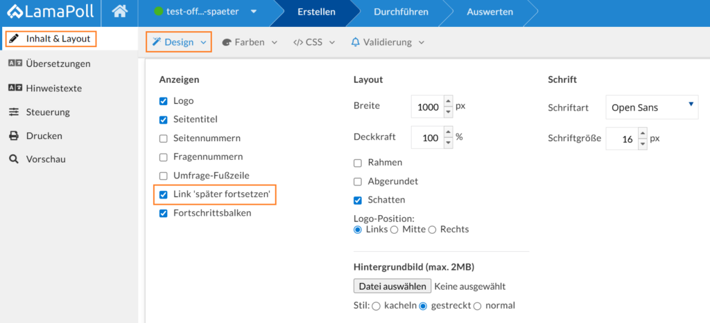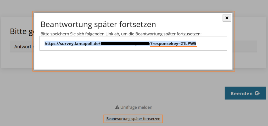 Sichtbar wird diese Art Zugangsschlüssel für Teilnehmer aber nur an einer Stelle: Wenn Sie die Option „Link ’später fortsetzen'“ innerhalb des Fragebogens über „Design“ aktiviert haben (siehe Abbildung 3) und ein Teilnehmender diese Möglichkeit wahrnimmt (siehe Abbildung 4).