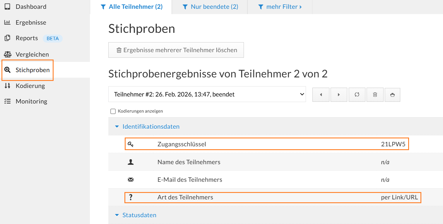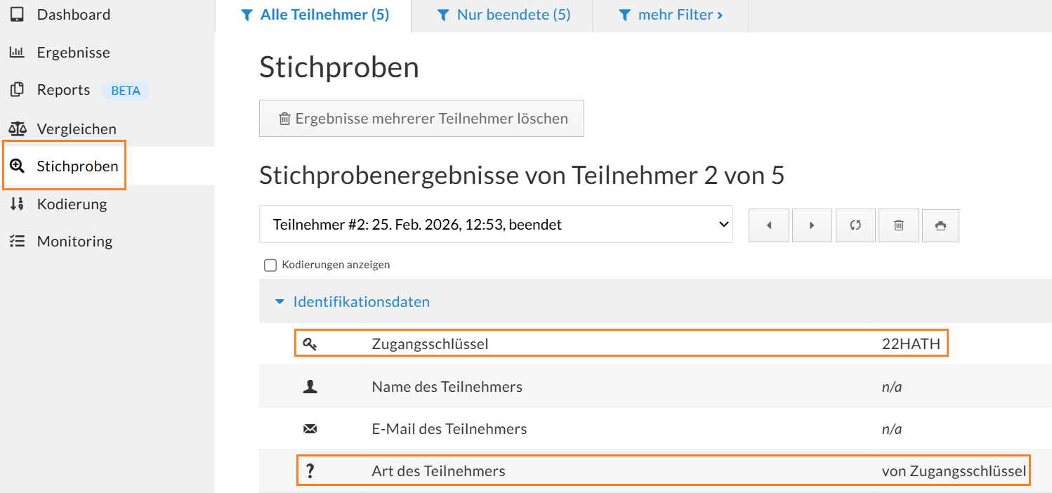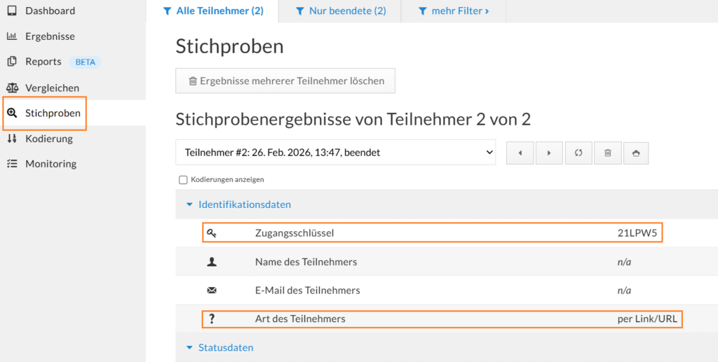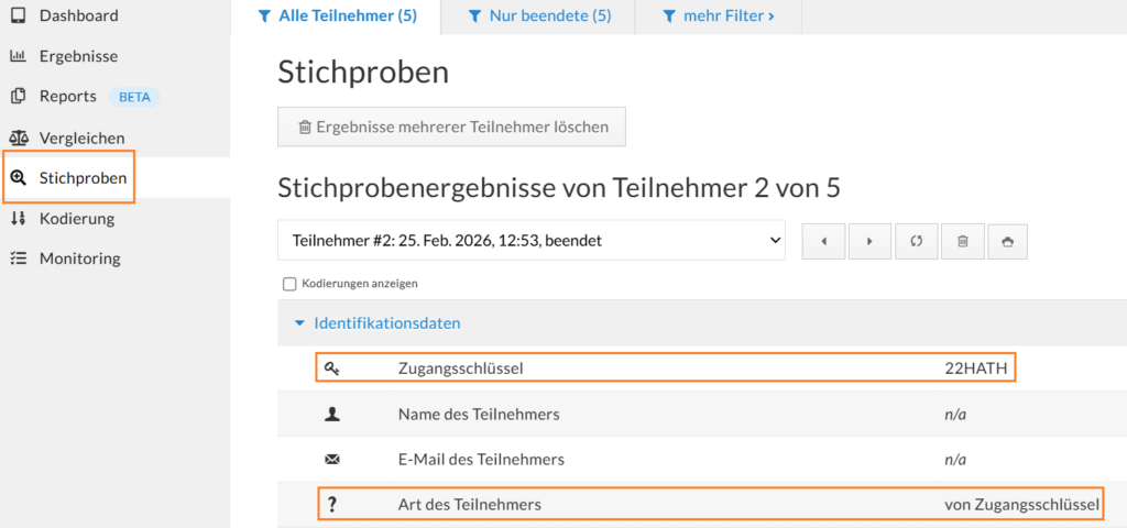 Wird dieser Direktlink mit Zugangsschlüssel (hier “22HATH“) an einen Teilnehmer versendet und dieser schließt den Fragebogen ab, erscheint nun der exakte Schlüssel in den Stichproben, während die Teilnahmeart als „von Zugangsschlüssel“ gekennzeichnet wird (siehe Abbildung 7).
