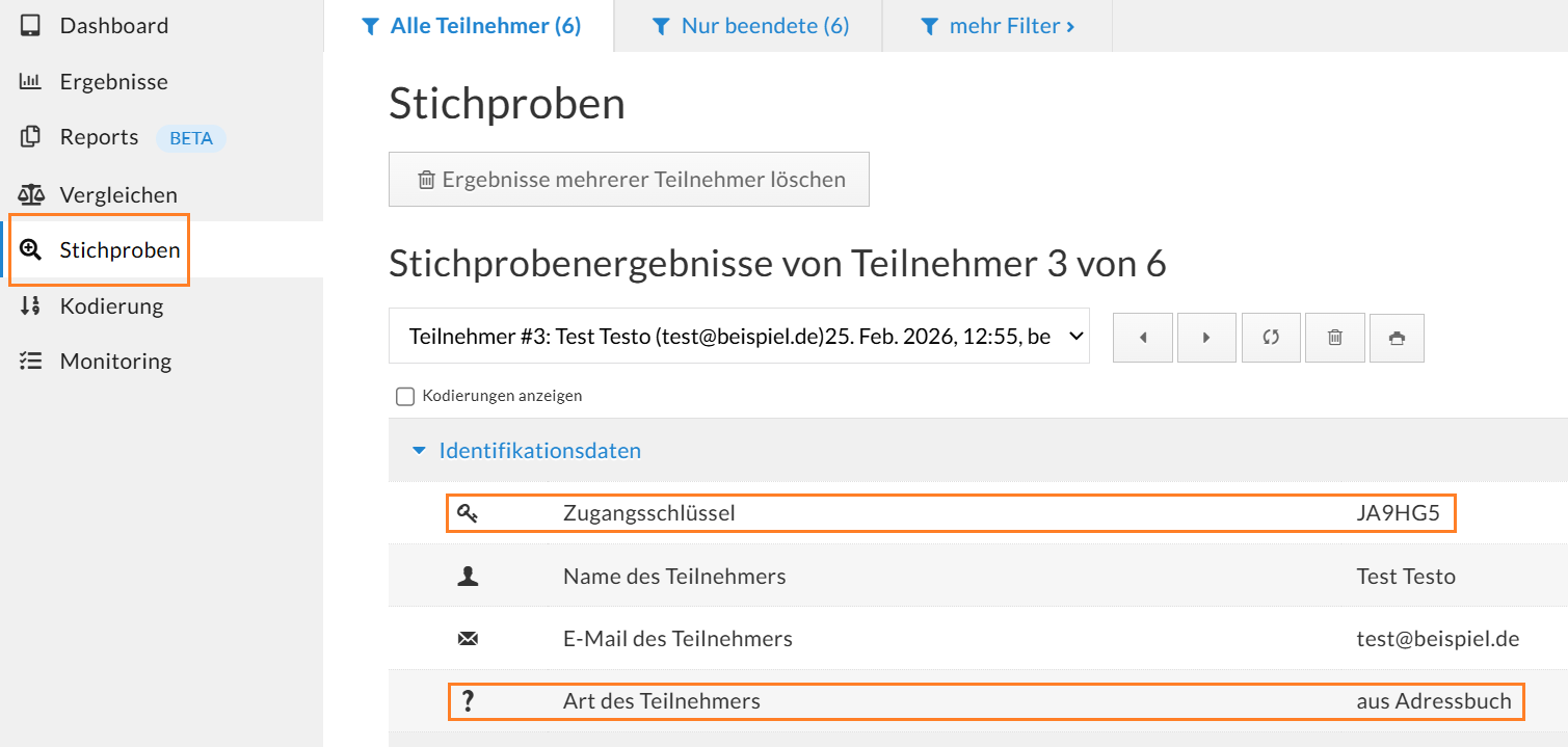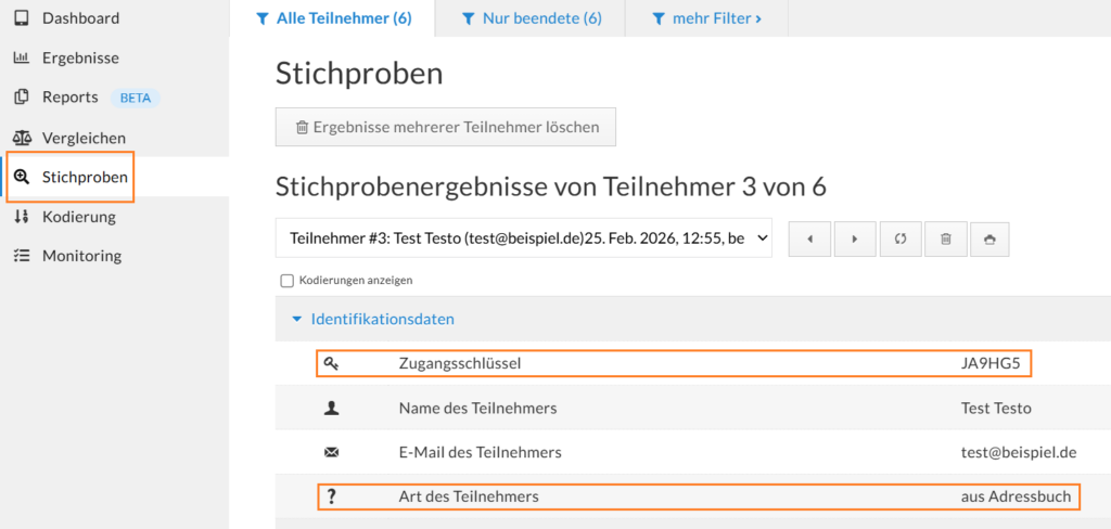 Für unser Beispiel haben wir eine Einladung über das LamaPoll-Adressbuch versendet. Anschließend hat der Teilnehmer den Einladungs-Link aus der E-Mail genutzt, um den Fragebogen zu öffnen und zu beantworten. Der in der E-Mail enthaltene Link beinhaltet bereits den individuellen Zugangsschlüssel. Dieser ist ebenfalls in den Stichproben einsehbar. Die „Art des Teilnehmers“ ist in diesem Fall „aus Adressbuch“ (siehe Abbildung 9).