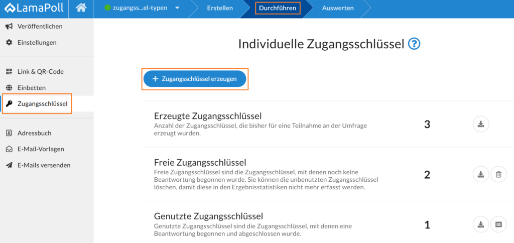 Mit LamaPoll haben Sie die Möglichkeit, über die Bereich „Durchführen“ > „Zugangsschlüssel“ individuelle Zugangsschlüssel für Ihre Umfrageteilnehmer zu erzeugen (siehe Abbildung 5).